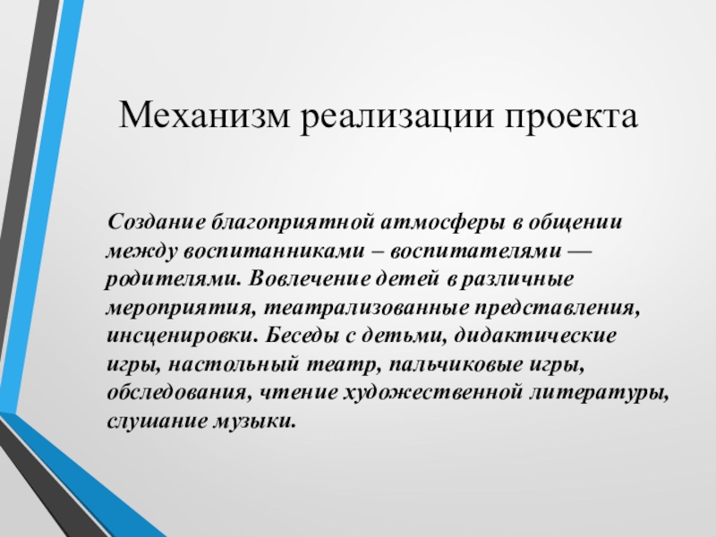 – воспитателями — родителями. Вовлечение детей в различные мероприятия, театрализованные представления, инсценировки. Беседы с детьми, дидактические игры, настольный театр, пальчиковые игры, обследования, чтение художественной литературы, слушание музыки.