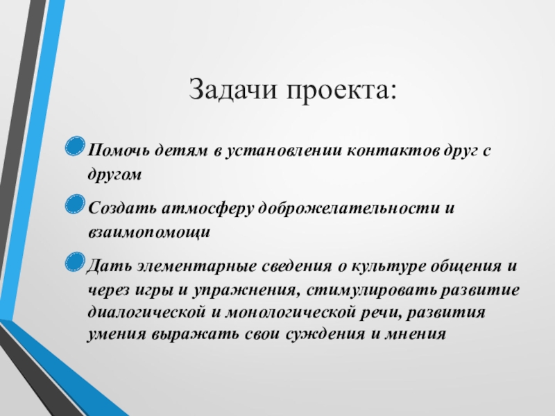 Дать элементарные сведения о культуре общения и через игры и упражнения, стимулировать развитие диалогической и монологической речи, развития умения выражать свои суждения и мнения