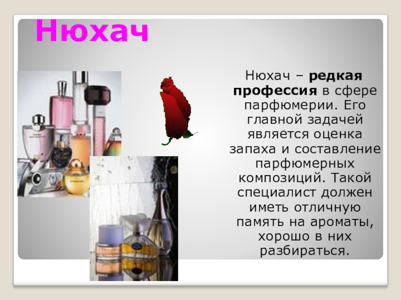 Нюхач Нюхач – редкая профессия в сфере парфюмерии. Его главной задачей является оценка запаха и составление парфюмерных