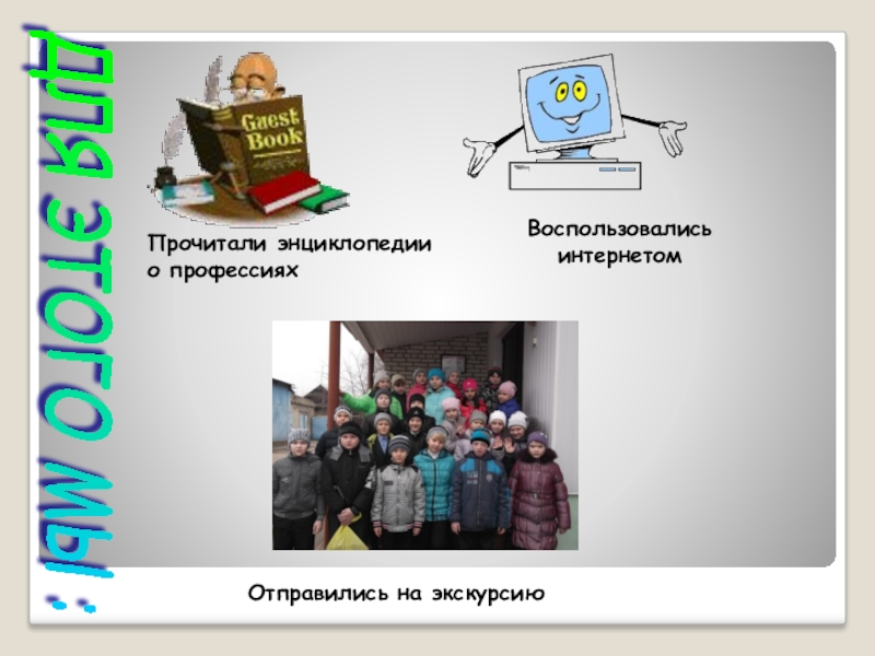 ДЛЯ ЭТОГО МЫ: Прочитали энциклопедии о профессияхВоспользовались интернетомОтправились на экскурсию