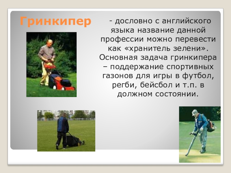 перевести как «хранитель зелени». Основная задача гринкипера – поддержание спортивных газонов для игры в футбол, регби, бейсбол и т.п. в должном состоянии.