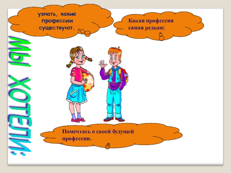 узнать, какие профессии существуют.Какая профессия самая редкая;Помечтать о своей будущей профессии.МЫ ХОТЕЛИ: