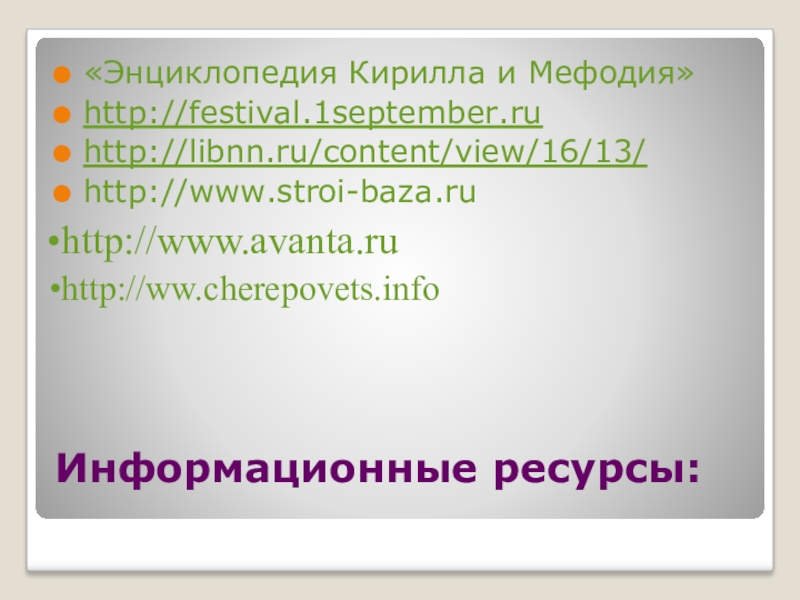 Информационные ресурсы:«Энциклопедия Кирилла и Мефодия»http://festival.1september.ruhttp://libnn.ru/content/view/16/13/http://www.stroi-baza.ru http://www.avanta.ruhttp://ww.cherepovets.info
