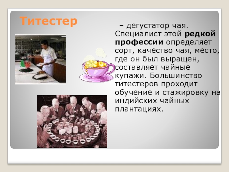 Титестер  – дегустатор чая. Специалист этой редкой профессии определяет сорт, качество чая, место, где он был