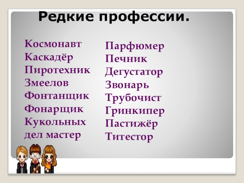 Редкие профессии. КосмонавтКаскадёрПиротехникЗмееловФонтанщикФонарщикКукольных дел мастерПарфюмерПечникДегустаторЗвонарьТрубочистГринкипер ПастижёрТитестор