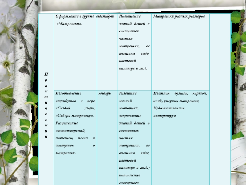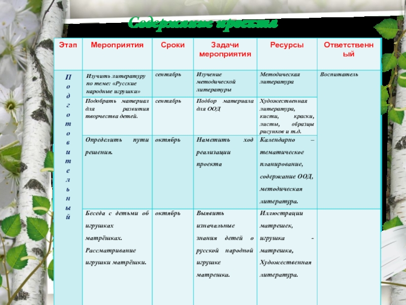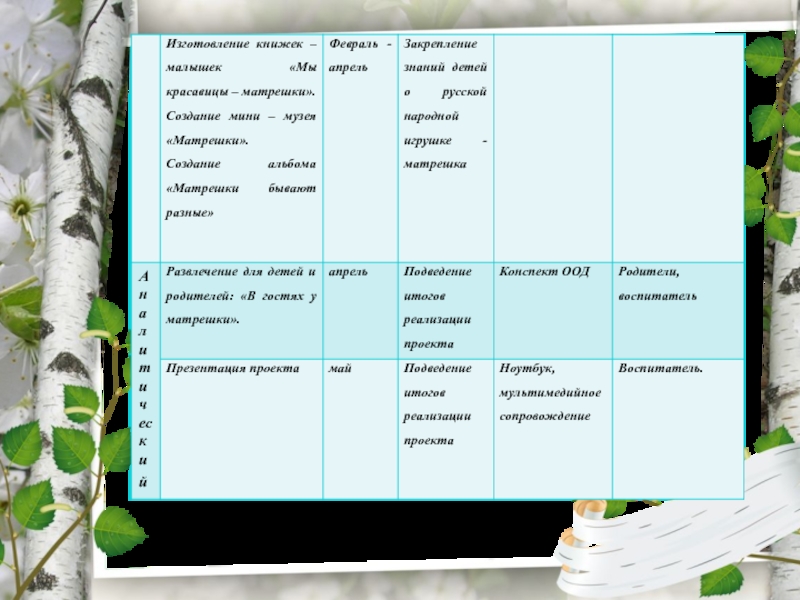 Материально - технические условия реализации проекта: изобразительные материалы; видеопрезентации «Матрешка