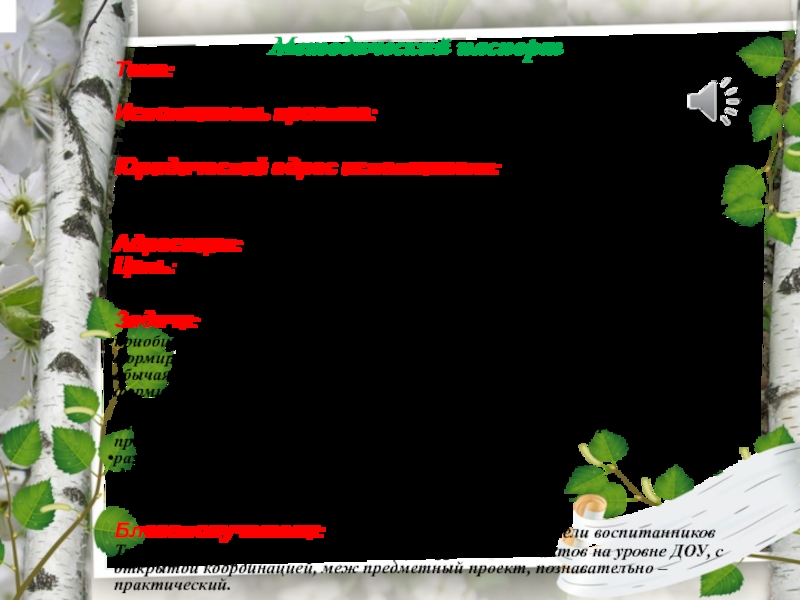 Типовые особенности: долгосрочный, по уровню контактов на уровне ДОУ, с открытой координацией, меж предметный проект, познавательно – практический.