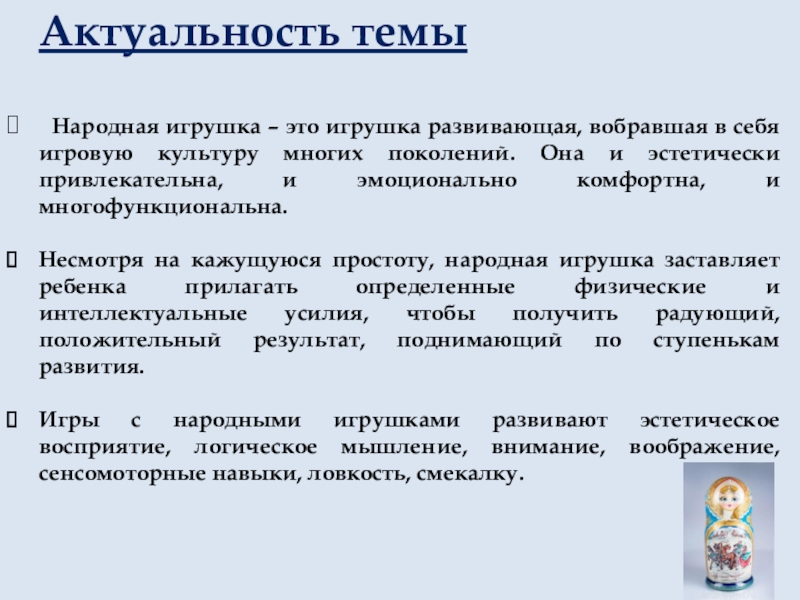 Народная игрушка – это игрушка развивающая, вобравшая в себя
