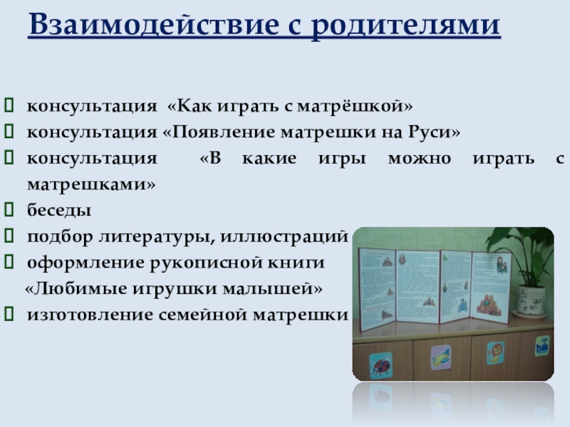 Принесённая из дома тематическая литература для чтения, самостоятельно нарисованные рисунки матрешек, сделанные своими руками, совместно с родителями, книжки-малышки «Матрёшка».