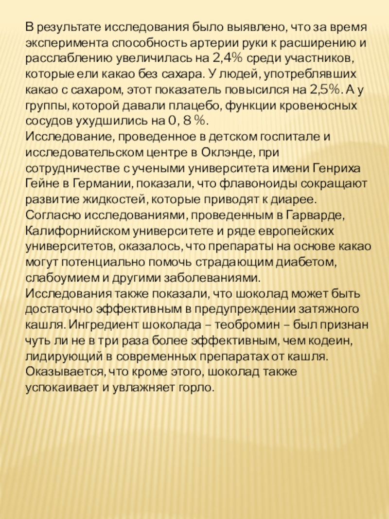 Слайд 20Мало того, британские исследователи доказали, что компоненты, полученные из плодов какао,