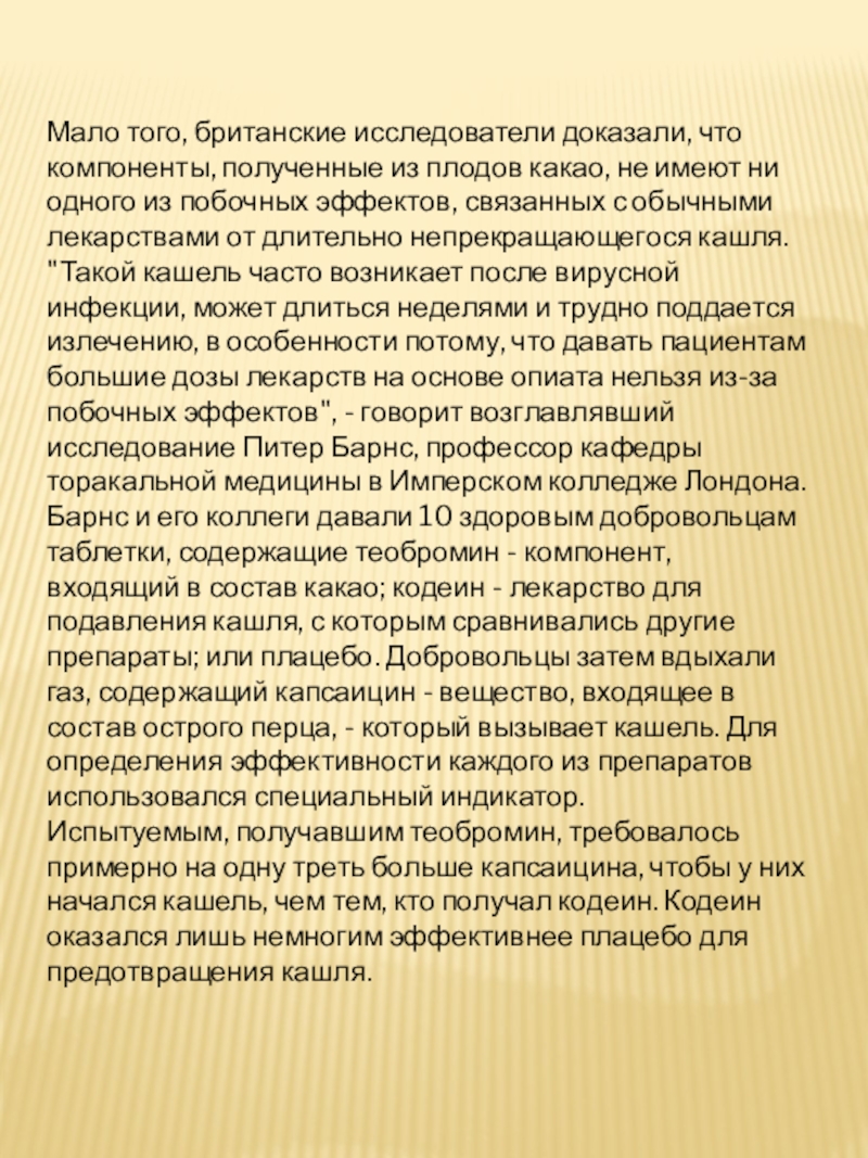 "Такой кашель часто возникает после вирусной инфекции, может длиться неделями и трудно поддается излечению, в особенности потому, что давать пациентам большие дозы лекарств на основе опиата нельзя из-за побочных эффектов", - говорит возглавлявший исследование Питер Барнс, профессор кафедры торакальной медицины в Имперском колледже Лондона. Барнс и его коллеги давали 10 здоровым добровольцам таблетки, содержащие теобромин - компонент, входящий в состав какао; кодеин - лекарство для подавления кашля, с которым сравнивались другие препараты; или плацебо. Добровольцы затем вдыхали газ, содержащий капсаицин - вещество, входящее в состав острого перца, - который вызывает кашель. Для определения эффективности каждого из препаратов использовался специальный индикатор.