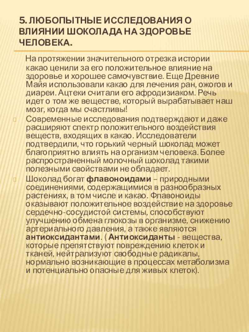 Шоколад богат флавоноидами – природными соединениями, содержащимися в разнообразных растениях, в том числе и какао. Флавоноиды оказывают положительное воздействие на здоровье сердечно-сосудистой системы, способствуют улучшению обмена глюкозы в организме, снижению артериального давления, а также являются антиоксидантами. ( Антиоксиданты - вещества, которые препятствуют повреждению клеток и тканей, нейтрализуют свободные радикалы, нормально возникающие в процессах метаболизма и потенциально опасные для живых клеток).