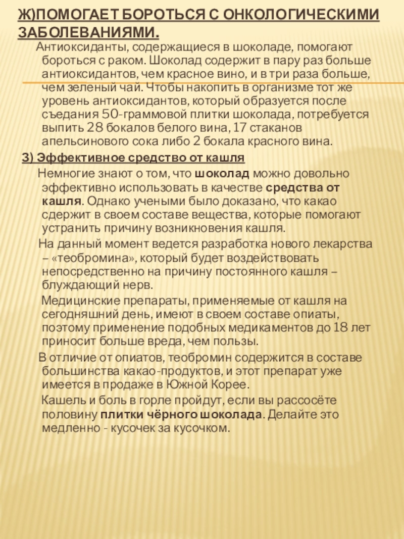 помогают бороться с раком. Шоколад содержит в пару раз больше антиоксидантов, чем красное вино, и в три раза больше, чем зеленый чай. Чтобы накопить в организме тот же уровень антиоксидантов, который образуется после съедания 50-граммовой плитки шоколада, потребуется выпить 28 бокалов белого вина, 17 стаканов апельсинового сока либо 2 бокала красного вина.