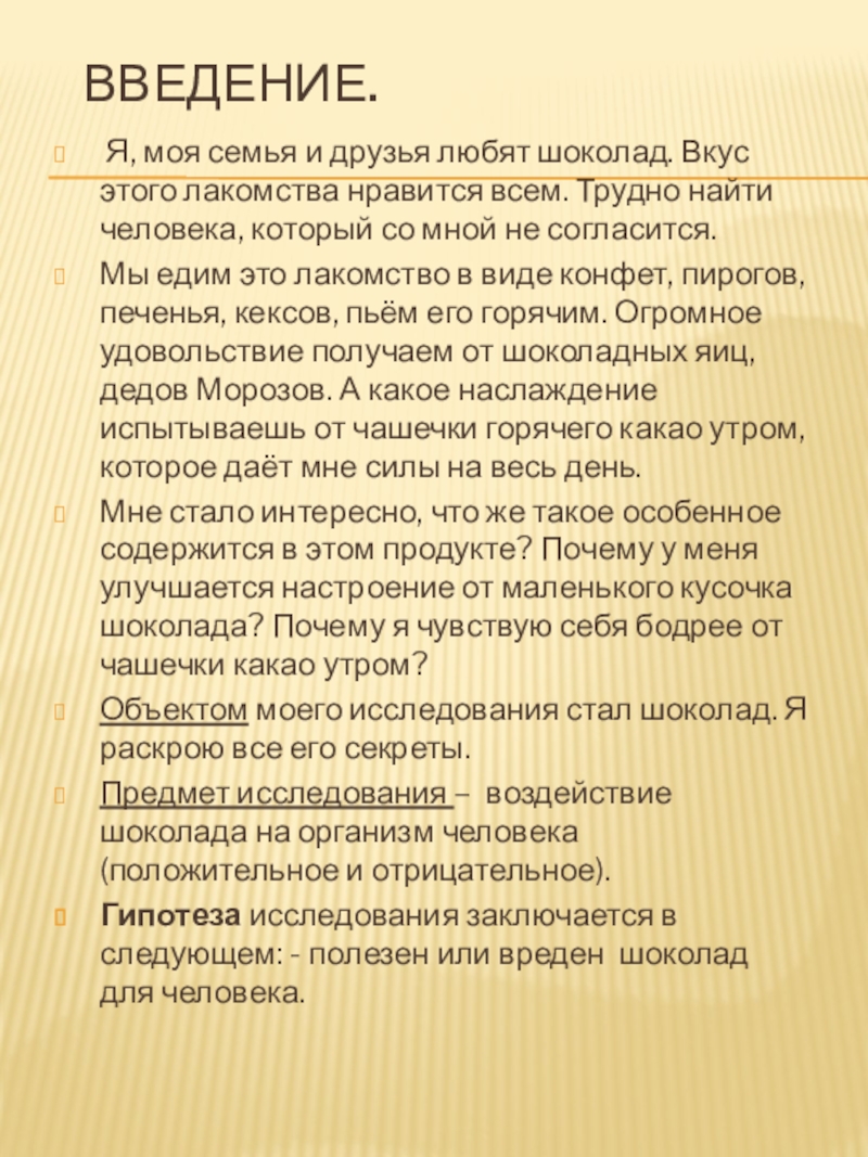 Гипотеза исследования заключается в следующем: - полезен или вреден шоколад для человека.