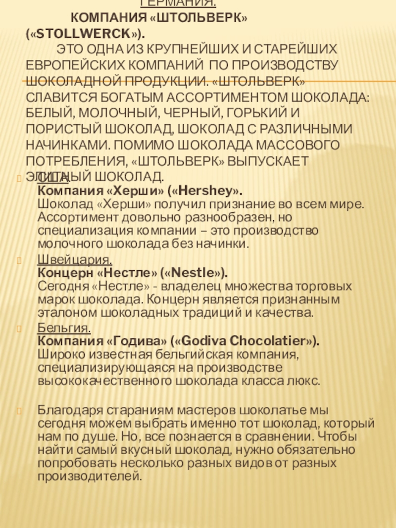 Сегодня «Нестле» - владелец множества торговых марок шоколада. Концерн является признанным эталоном шоколадных традиций и качества.