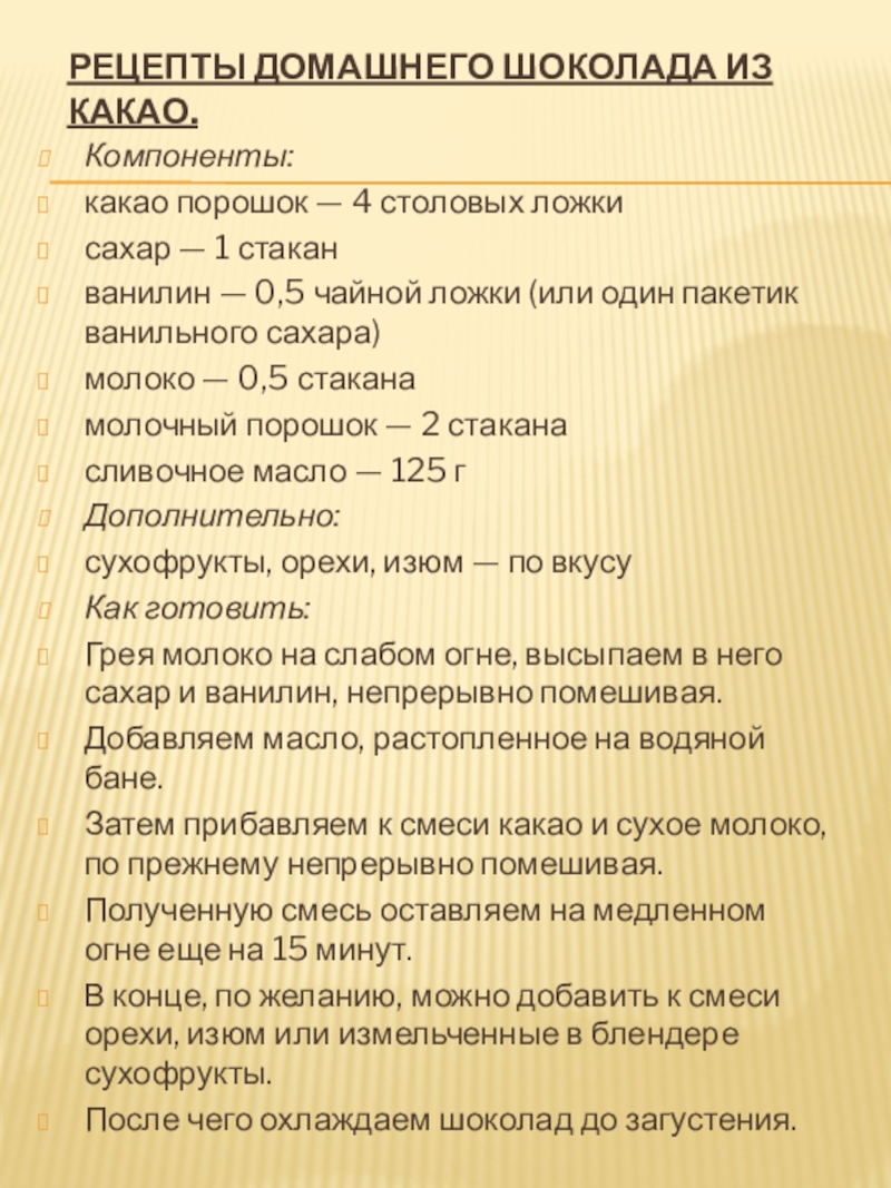 Слайд 22Рецепты домашнего шоколада из какао.