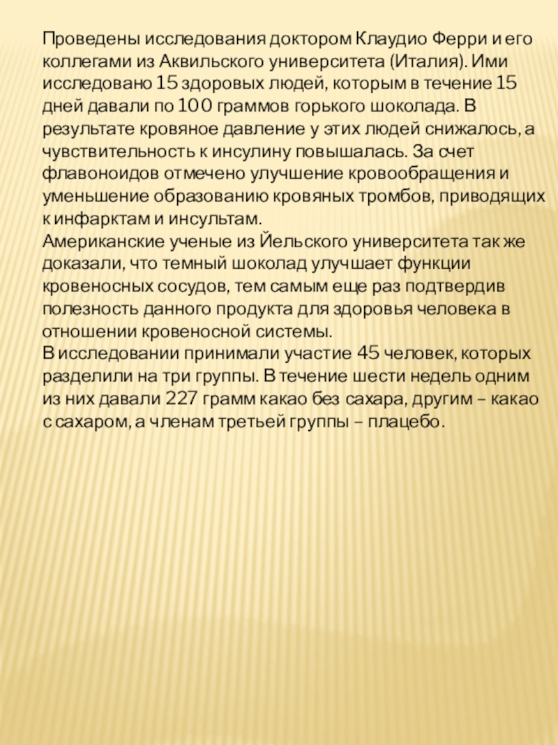 (Италия). Ими исследовано 15 здоровых людей, которым в течение 15 дней давали по 100 граммов горького шоколада. В результате кровяное давление у этих людей снижалось, а чувствительность к инсулину повышалась. За счет флавоноидов отмечено улучшение кровообращения и уменьшение образованию кровяных тромбов, приводящих к инфарктам и инсультам.