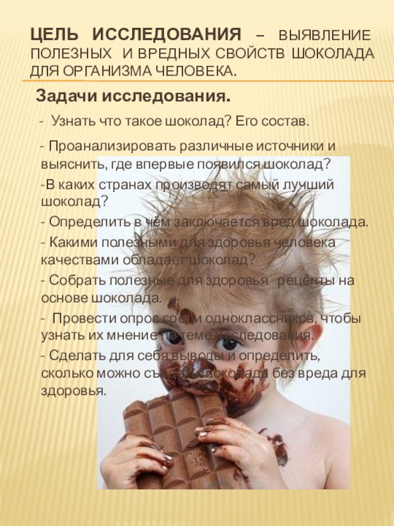 Слайд 3Цель исследования – выявление полезных и вредных свойств шоколада для организма