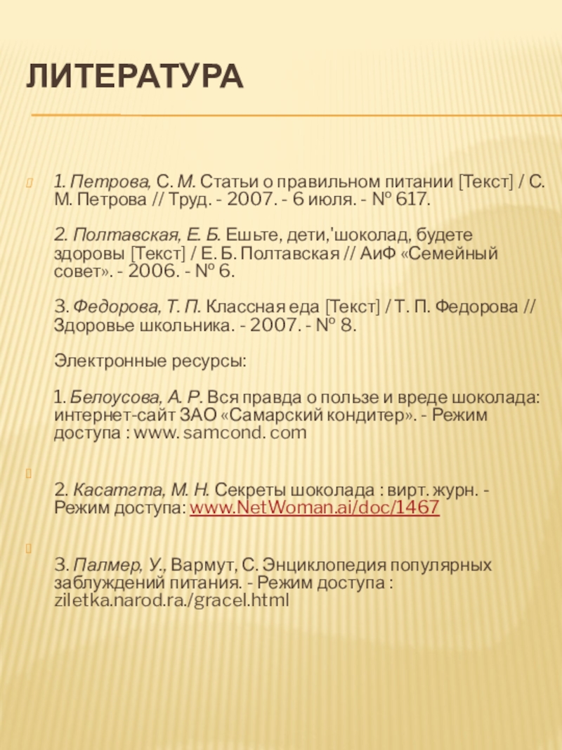 1. Белоусова, А. Р. Вся правда о пользе и вреде шоколада: интернет-сайт ЗАО «Самарский кондитер». - Режим доступа : www. samcond. com