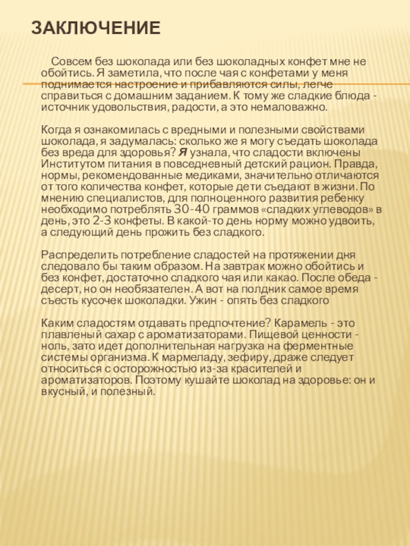 Когда я ознакомилась с вредными и полезными свойствами шоколада, я задумалась: сколько же я могу съедать шоколада без вреда для здоровья? Я узнала, что сладости включены Институтом питания в повседневный детский рацион. Правда, нормы, рекомендованные медиками, значительно отличаются от того количества конфет, которые дети съедают в жизни. По мнению специалистов, для полноценного развития ребенку необходимо потреблять 30-40 граммов «сладких углеводов» в день, это 2-3 конфеты. В какой-то день норму можно удвоить, а следующий день прожить без сладкого.