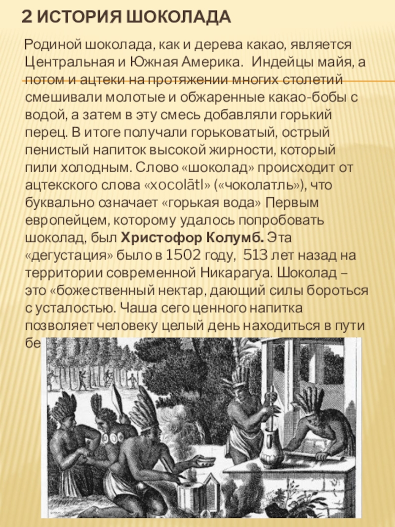 является Центральная и Южная Америка. Индейцы майя, а потом и ацтеки на протяжении многих столетий смешивали молотые и обжаренные какао-бобы с водой, а затем в эту смесь добавляли горький перец. В итоге получали горьковатый, острый пенистый напиток высокой жирности, который пили холодным. Слово «шоколад» происходит от ацтекского слова «xocolātl» («чоколатль»), что буквально означает «горькая вода» Первым европейцем, которому удалось попробовать шоколад, был Христофор Колумб. Эта «дегустация» было в 1502 году, 513 лет назад на территории современной Никарагуа. Шоколад – это «божественный нектар, дающий силы бороться с усталостью. Чаша сего ценного напитка позволяет человеку целый день находиться в пути без пищи».