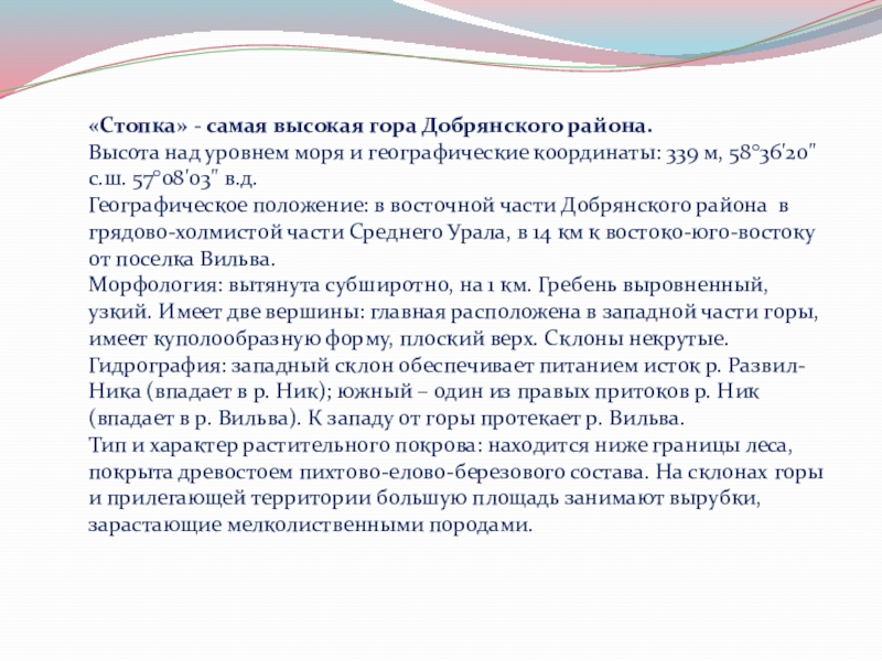 Географическое положение: в восточной части Добрянского района в грядово-холмистой части Среднего Урала, в 14 км к востоко-юго-востоку от поселка Вильва.