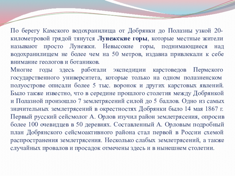 Многие годы здесь работали экспедиции карстоведов Пермского государственного университета, которые только на одном полазненском полуострове описали более 5 тыс. воронок и других карстовых явлений. Было также известно, что в середине прошлого столетия между Добрянкой и Полазной произошло 7 землетрясений силой до 5 баллов. Одно из самых значительных землетрясений в окрестностях Добрянки было 14 мая 1867 г. Первый русский сейсмолог А. Орлов изучил район землетрясения, опросив более 100 очевидцев в 50 деревнях. Составленный А. Орловым подробный план Добрянского сейсмоактивного района стал первой в России схемой распространения землетрясения. Несколько слабых землетрясений, а также случайных провалов и просадок отмечены здесь и в нынешнем столетии.