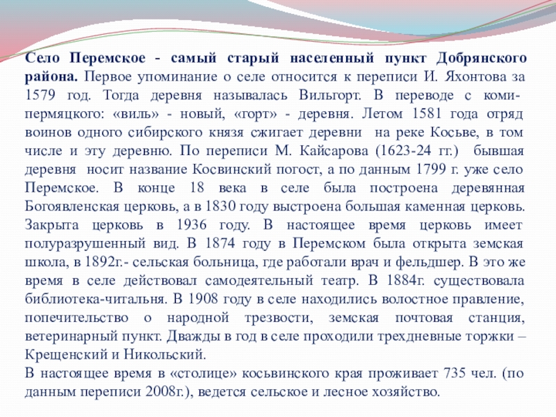 Слайд 15Село Перемское - самый старый населенный пункт Добрянского района. Первое упоминание