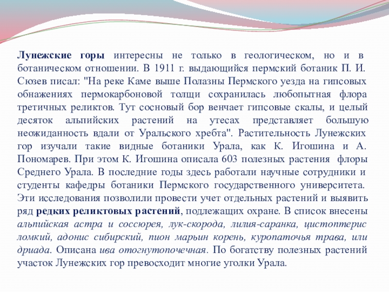 отношении. В 1911 г. выдающийся пермский ботаник П. И.Сюзев писал: "На реке Каме выше Полазны Пермского уезда на гипсовых обнажениях пермокарбоновой толщи сохранилась любопытная флора третичных реликтов. Тут сосновый бор венчает гипсовые скалы, и целый десяток альпийских растений на утесах представляет большую неожиданность вдали от Уральского хребта". Растительность Лунежских гор изучали такие видные ботаники Урала, как К. Игошина и А. Пономарев. При этом К. Игошина описала 603 полезных растения флоры Среднего Урала. В последние годы здесь работали научные сотрудники и студенты кафедры ботаники Пермского государственного университета. Эти исследования позволили провести учет отдельных растений и выявить ряд редких реликтовых растений, подлежащих охране. В список внесены альпийская астра и соссюрея, лук-скорода, лилия-саранка, цистоптерис ломкий, адонис сибирский, пион марьин корень, куропаточья трава, или дриада. Описана ива отогнутопочечная. По богатству полезных растений участок Лунежских гор превосходит многие уголки Урала.