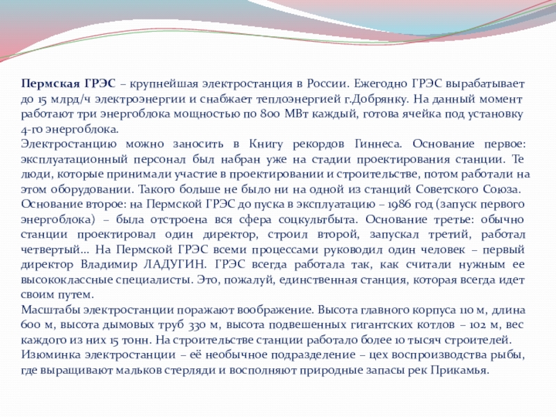 Пермская ГРЭС – крупнейшая электростанция в России. Ежегодно ГРЭС вырабатывает до