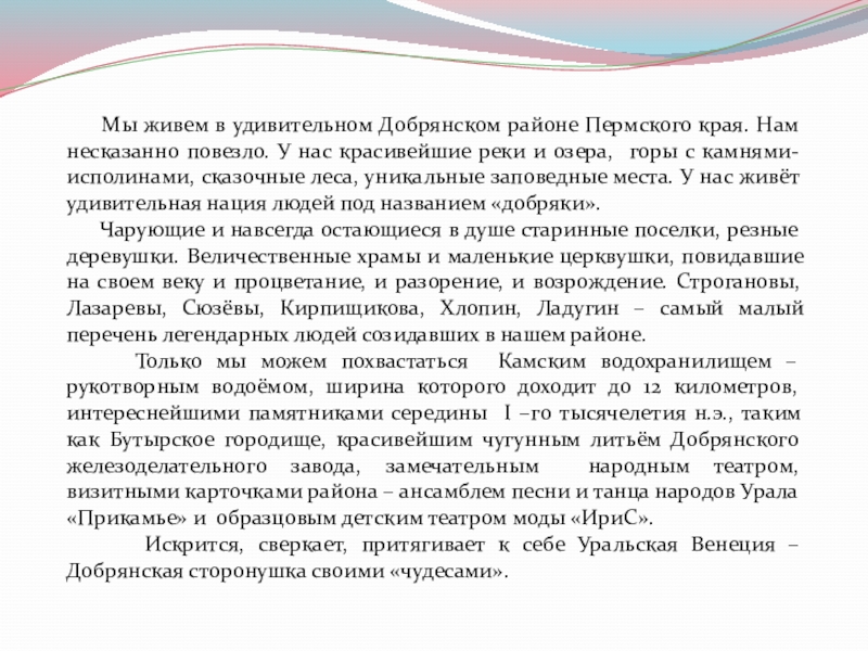 Слайд 2 Мы живем в удивительном Добрянском районе Пермского края.