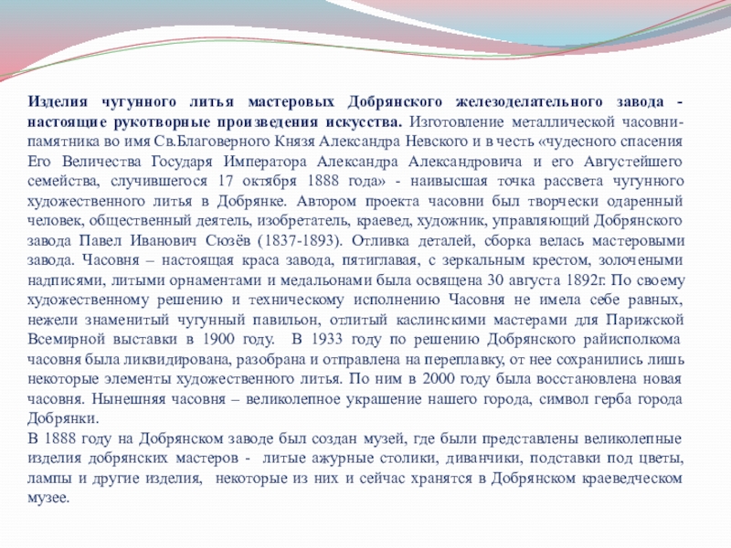 искусства. Изготовление металлической часовни-памятника во имя Св.Благоверного Князя Александра Невского и в честь «чудесного спасения Его Величества Государя Императора Александра Александровича и его Августейшего семейства, случившегося 17 октября 1888 года» - наивысшая точка рассвета чугунного художественного литья в Добрянке. Автором проекта часовни был творчески одаренный человек, общественный деятель, изобретатель, краевед, художник, управляющий Добрянского завода Павел Иванович Сюзёв (1837-1893). Отливка деталей, сборка велась мастеровыми завода. Часовня – настоящая краса завода, пятиглавая, с зеркальным крестом, золочеными надписями, литыми орнаментами и медальонами была освящена 30 августа 1892г. По своему художественному решению и техническому исполнению Часовня не имела себе равных, нежели знаменитый чугунный павильон, отлитый каслинскими мастерами для Парижской Всемирной выставки в 1900 году. В 1933 году по решению Добрянского райисполкома часовня была ликвидирована, разобрана и отправлена на переплавку, от нее сохранились лишь некоторые элементы художественного литья. По ним в 2000 году была восстановлена новая часовня. Нынешняя часовня – великолепное украшение нашего города, символ герба города Добрянки.