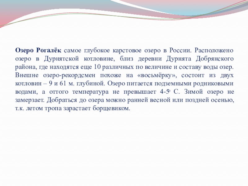 Слайд 13Озеро Рогалёк самое глубокое карстовое озеро в России. Расположено озеро в