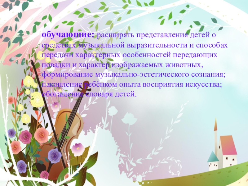 выразительности и способах передачи характерных особенностей передающих повадки и характер изображаемых животных, формирование музыкально-эстетического сознания; накопление ребёнком опыта восприятия искусства; обогащение словаря детей.