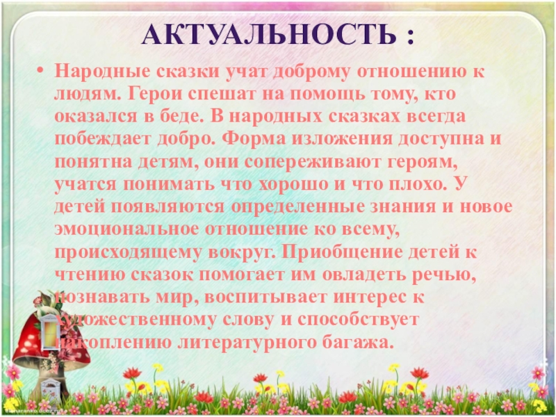 помощь тому, кто оказался в беде. В народных сказках всегда побеждает добро. Форма изложения доступна и понятна детям, они сопереживают героям, учатся понимать что хорошо и что плохо. У детей появляются определенные знания и новое эмоциональное отношение ко всему, происходящему вокруг. Приобщение детей к чтению сказок помогает им овладеть речью, познавать мир, воспитывает интерес к художественному слову и способствует накоплению литературного багажа.