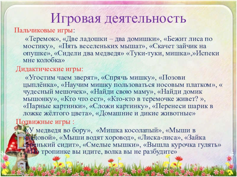 «Угостим чаем зверят», «Спрячь мишку», «Позови цыплёнка», «Научим мишку пользоваться носовым платком», « чудесный мешочек», «Найди свою маму», «Найди домик мышонку», «Кто что ест», «Кто-кто в теремочке живет? », «Парные картинки», «Сложи картинку», «Перенеси шарик в ложке жёлтого цвета», «Домашние и дикие животные»
