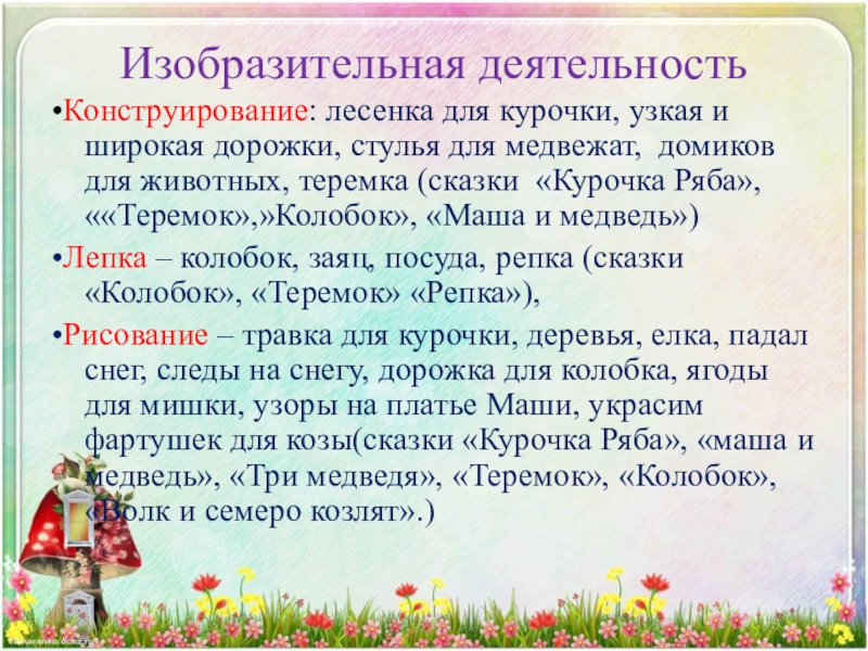 •Рисование – травка для курочки, деревья, елка, падал снег, следы на снегу, дорожка для колобка, ягоды для мишки, узоры на платье Маши, украсим фартушек для козы(сказки «Курочка Ряба», «маша и медведь», «Три медведя», «Теремок», «Колобок», «Волк и семеро козлят».)