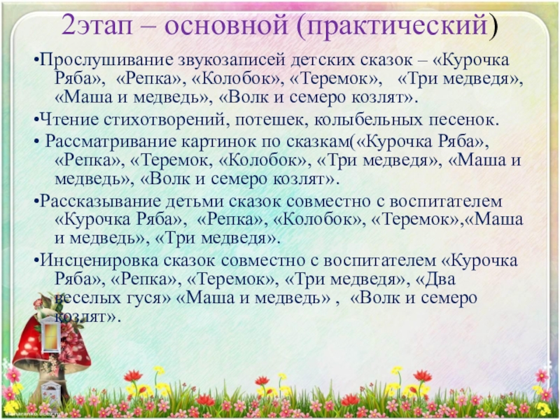 «Колобок», «Теремок», «Три медведя», «Маша и медведь», «Волк и семеро козлят».