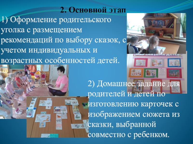 2) Домашнее задание для родителей и детей по изготовлению карточек с изображением сюжета из сказки, выбранной совместно с ребенком.