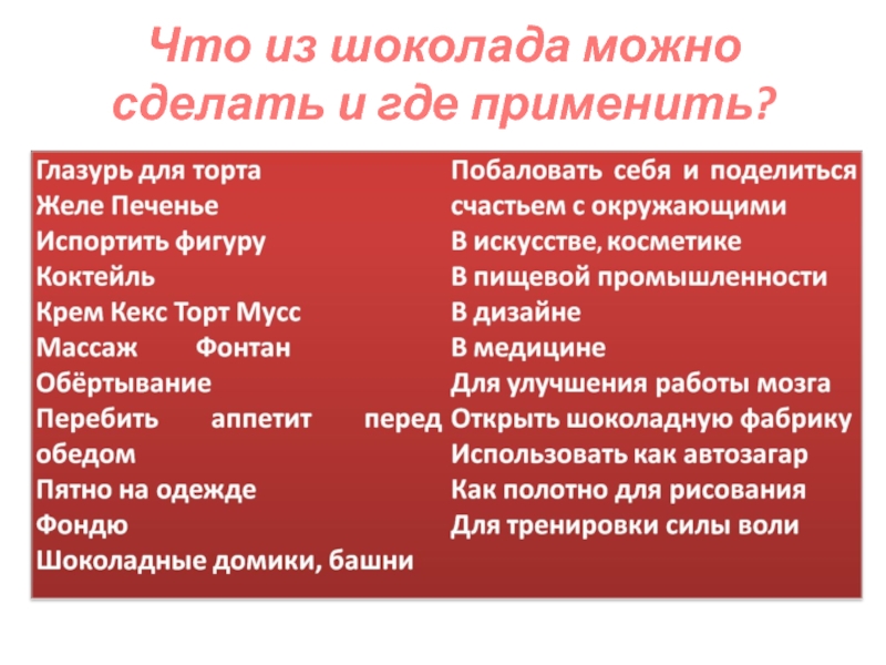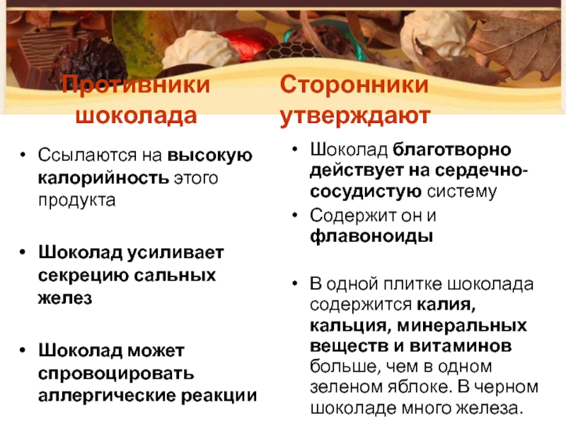 В одной плитке шоколада содержится калия, кальция, минеральных веществ и витаминов больше, чем в одном зеленом яблоке. В черном шоколаде много железа.