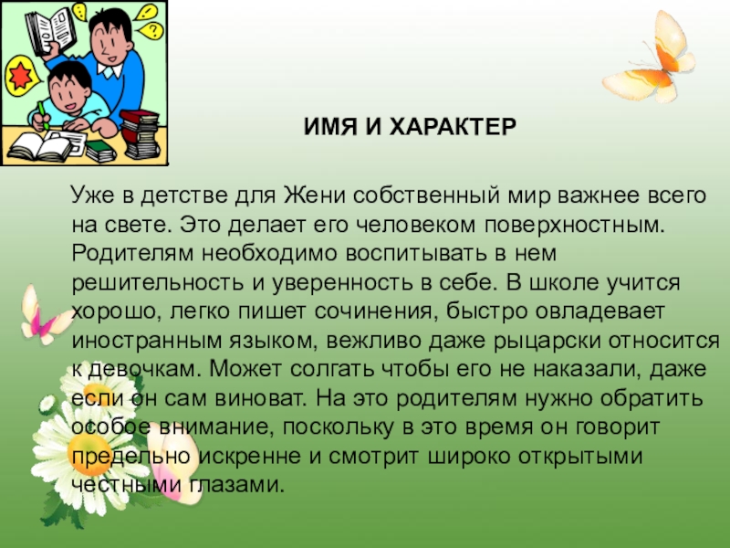 Уже в детстве для Жени собственный мир важнее всего на свете. Это делает его человеком поверхностным. Родителям необходимо воспитывать в нем решительность и уверенность в себе. В школе учится хорошо, легко пишет сочинения, быстро овладевает иностранным языком, вежливо даже рыцарски относится к девочкам. Может солгать чтобы его не наказали, даже если он сам виноват. На это родителям нужно обратить особое внимание, поскольку в это время он говорит предельно искренне и смотрит широко открытыми честными глазами.