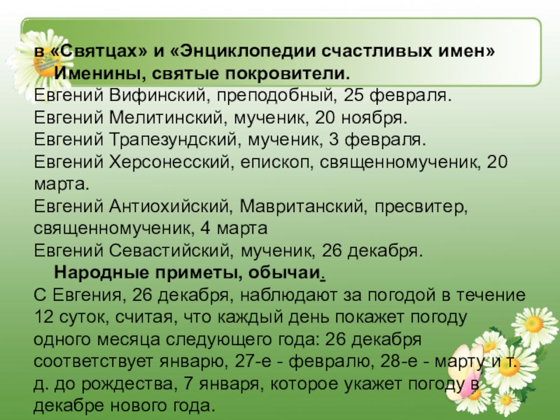 С Евгения, 26 декабря, наблюдают за погодой в течение 12 суток, считая, что каждый день покажет погоду одного месяца следующего года: 26 декабря соответствует январю, 27-е - февралю, 28-е - марту и т. д. до рождества, 7 января, которое укажет погоду в декабре нового года.