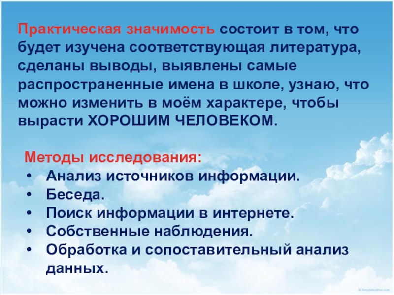 Практическая значимость состоит в том, что будет изучена соответствующая литература, сделаны выводы, выявлены самые распространенные имена в школе, узнаю, что можно изменить в моём характере, чтобы вырасти ХОРОШИМ ЧЕЛОВЕКОМ.