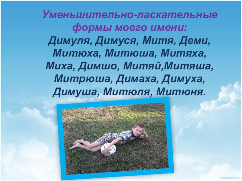 Миха, Димшо, Митяй,Митяша, Митрюша, Димаха, Димуха, Димуша, Митюля, Митюня.
