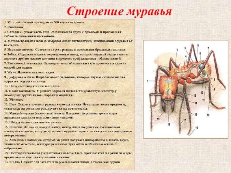11. Ядовитая железа. У рыжего муравья выделяет муравьиную кислоту, у некоторых других видов - парализующий яд.