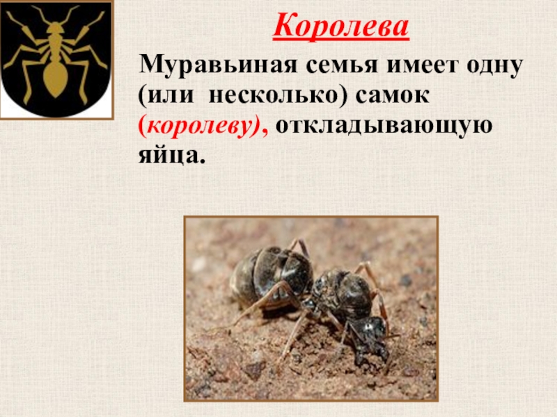Муравьиная семья имеет одну (или несколько) самок (королеву), откладывающую