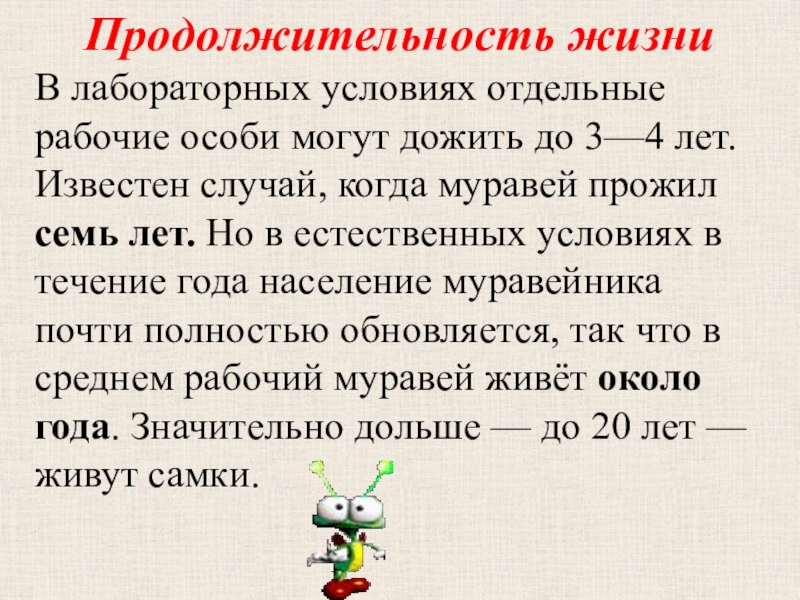 лет. Известен случай, когда муравей прожил семь лет. Но в естественных условиях в течение года население муравейника почти полностью обновляется, так что в среднем рабочий муравей живёт около года. Значительно дольше — до 20 лет — живут самки.