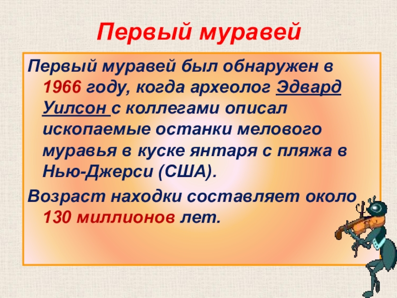 Первый муравей был обнаружен в 1966 году, когда археолог Эдвард Уилсон