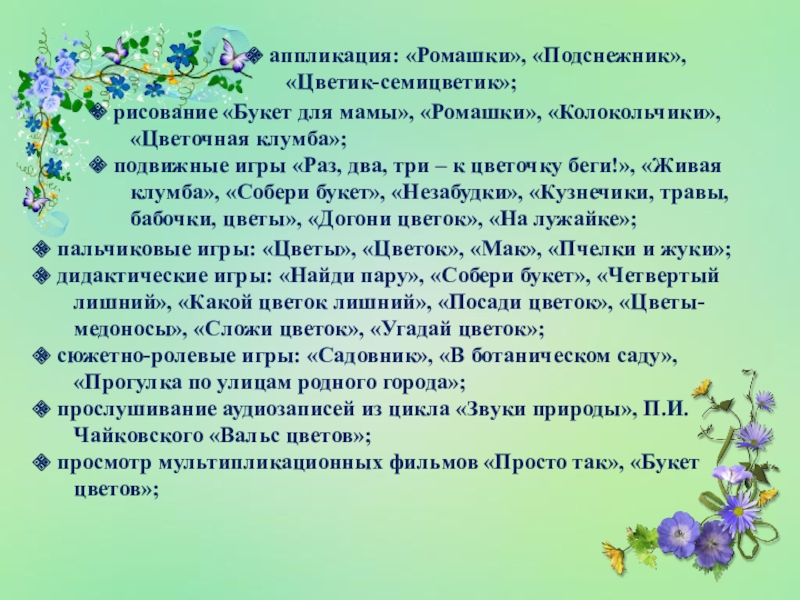 клумба», «Собери букет», «Незабудки», «Кузнечики, травы,