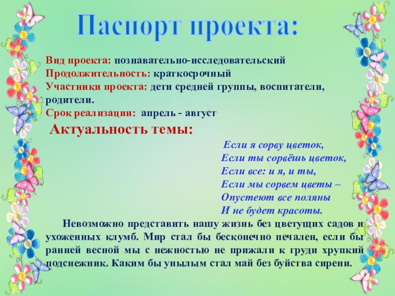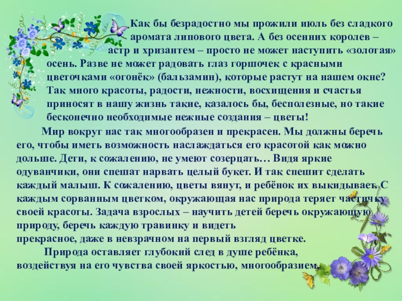 Мир вокруг нас так многообразен и прекрасен. Мы должны беречь его, чтобы иметь возможность наслаждаться его красотой как можно дольше. Дети, к сожалению, не умеют созерцать… Видя яркие одуванчики, они спешат нарвать целый букет. И так спешит сделать каждый малыш. К сожалению, цветы вянут, и ребёнок их выкидывает. С каждым сорванным цветком, окружающая нас природа теряет частичку своей красоты. Задача взрослых – научить детей беречь окружающую природу, беречь каждую травинку и видеть